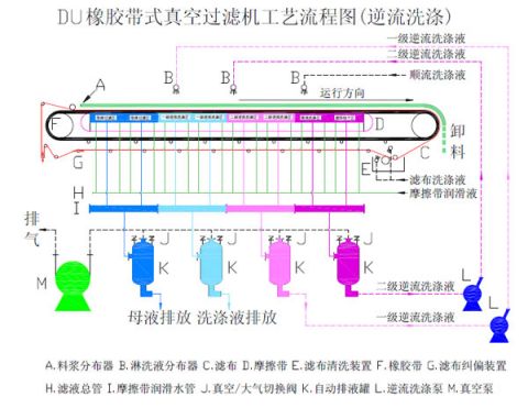 PBF型帶式真空過濾機以濾布為過濾介質(zhì),充分利用物料重力和真空吸力實現(xiàn)固液分離的設(shè)備。采用 整體可拆式的過濾盤作為真空室,濾布由驅(qū)動輥拖動連續(xù)運行。過濾行程開始時,濾盤在真空狀態(tài)下與濾布同步運行;在非真空狀態(tài)下,濾盤與濾布相對運行。物料通過料漿分布器均布在真空濾盤的過濾帶上,濾布上的料漿在真空吸力的作用下進(jìn)行抽濾。當(dāng)真空濾盤移動一定行程后,控制系統(tǒng)切斷真空,真空濾盤在氣缸的拖動 下迅速返回到原始位置,濾布在驅(qū)動輥的拖動下繼續(xù)運行,從而實現(xiàn)物料母液抽濾、濾餅洗滌、抽干等過程,濾餅在卸料處被置卸除,濾布經(jīng)清洗后獲得再 生,再經(jīng)過一組支撐輥和糾偏裝置重新進(jìn)入過濾區(qū);濾液在集液罐中隨著濾盤返回時排出。